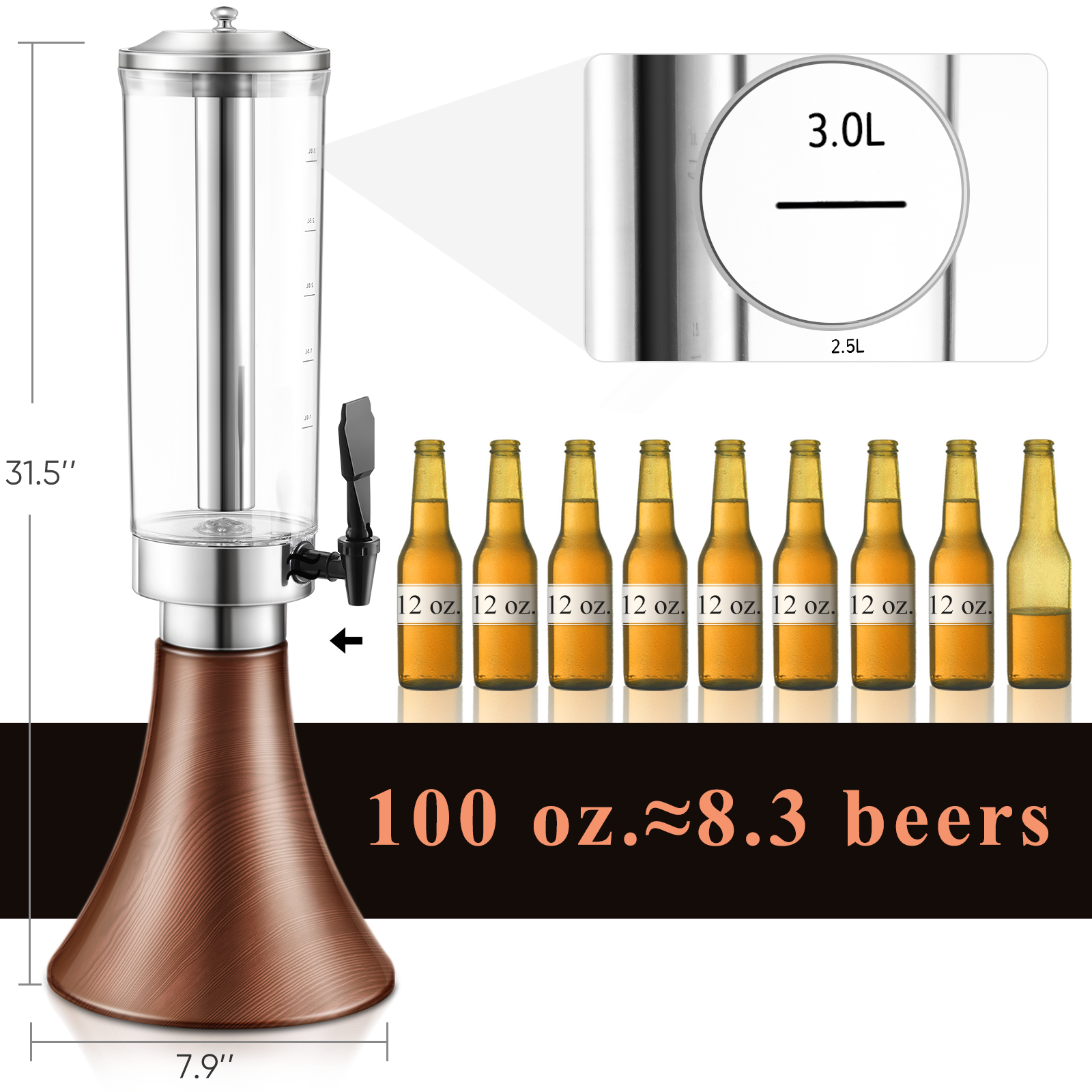 [100oz Large Dispenser]: The 100oz beer tower dispenser, which is equivalent to 8.3 12-oz bottles of beer, easily accommodates everyone at the table without having to refill the tower over and over. You can place the tower at the convenience of your guests and you don’t need to worry about refilling their drinks.