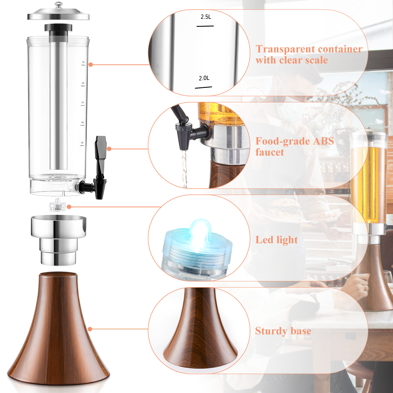 [Great Additions to Parties]: In addition to its dramatic and stylish appearance, Cosyoo beer tower adds to the decor and getup of your establishment with its transparent body and playful LED light. When illuminated, it brings a cool effect to your brew.